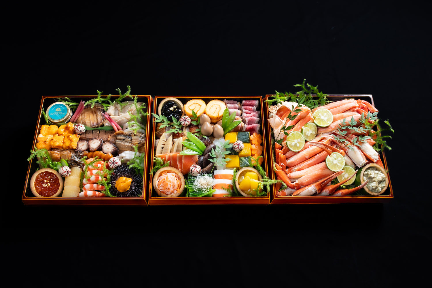 三河産鮑の塩蒸し(愛知県)/ 豊根ロイヤルキャビア(愛知県)/はまぐり煮物(愛知県)/ 車海老祝煮(愛知県)/ 伊勢海老黄身焼き(三重県)/ 三河一色産鰻佃煮山椒(愛知県)/ 日間賀島蛸柔らか煮(愛知県)/ 数の子/ 鰆幽庵焼き(愛知県)/ 鰤祝煮(三重県)/唐墨 / 蒸雲丹 花穂紫蘇 /田作り/ 愛西蓮根甘酢漬(愛知県)/矢生姜甘酢漬(愛知県)/ のどぐろ西京焼(愛知県)/ いくら醤油漬 / チシャトウ